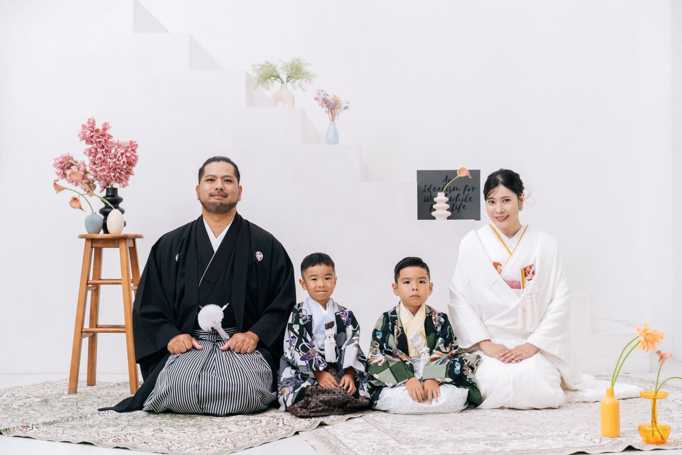 お子様と一緒に過ごす、和装での特別な時間。 白無垢と黒紋付の組み合わせが、シンプルな背景に映えてとても素敵で、 家族の笑顔があふれるしあわせ記念写真になりました。
