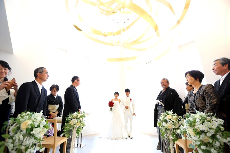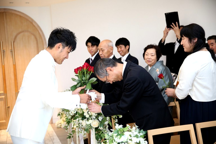 新婦よりも先に新郎が入場する際、先にゲストに渡しておいたバラを1本1本集めながら歩きます。その後新婦が入場し、新郎のところまで来たらダーズンローズを渡すという手順です!