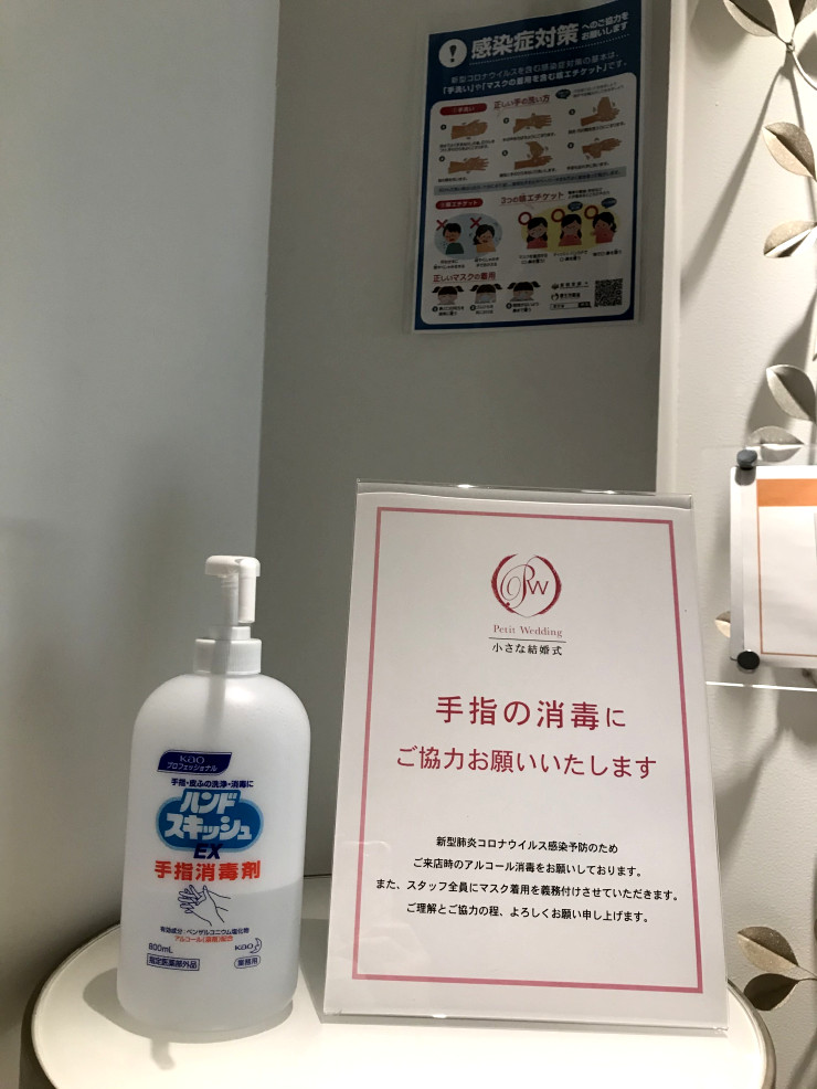 他にも、カウンター等に、アクリル板を設置し、透明板越しにお話しさせていただいたり、お衣装合わせの際には、スタッフが、フェイスガードやグローブを付けてご対応いたします。