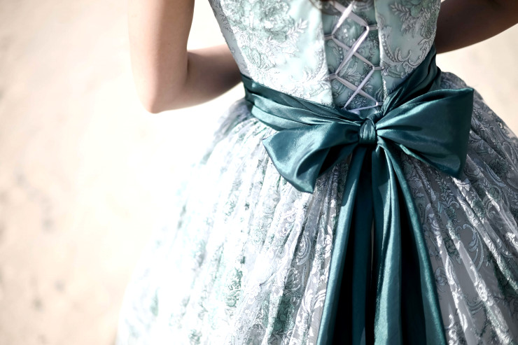 ウエストラインに巻いた深いグリーンのリボンが特徴的な