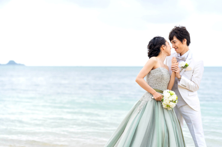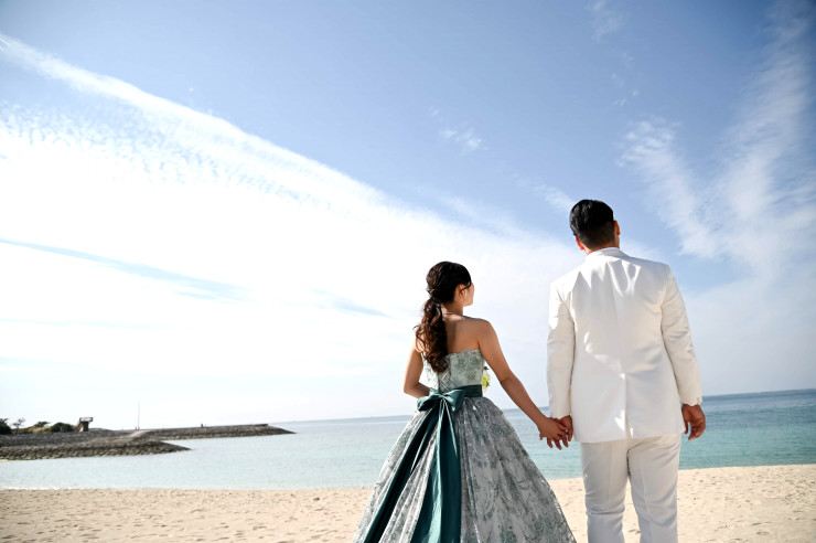 結婚式でお召しになったお衣裳でビーチ撮影のスタートです!