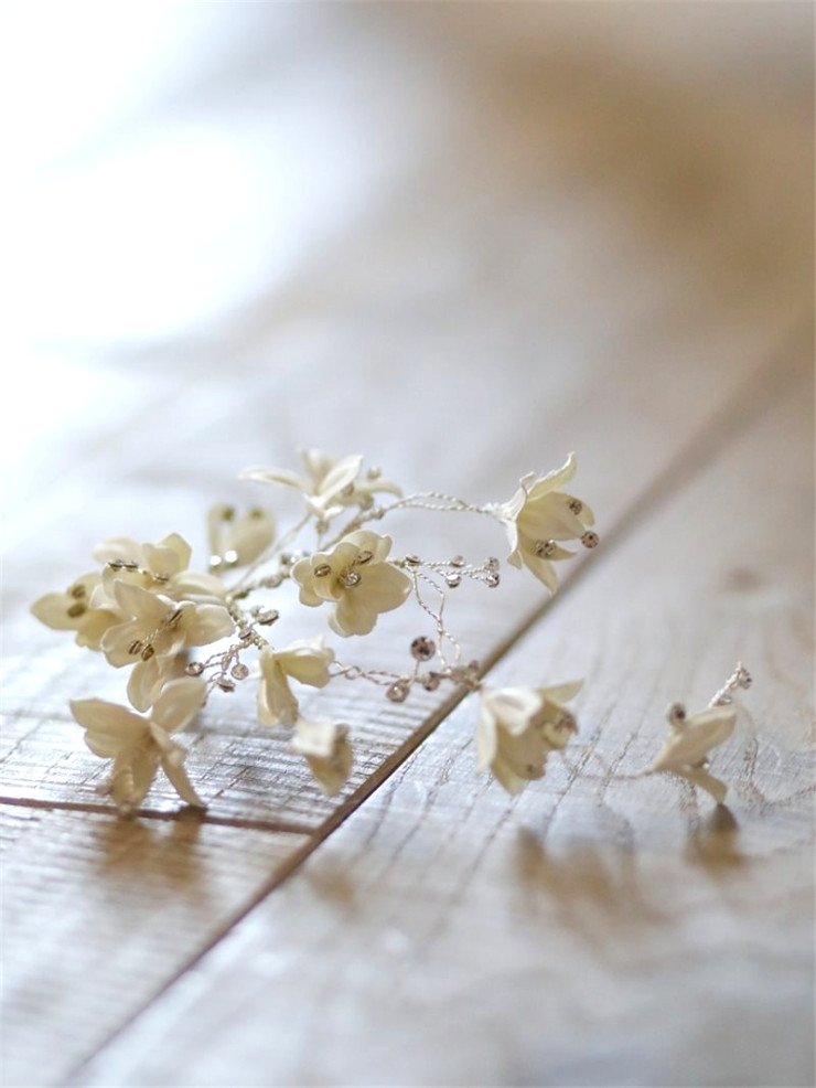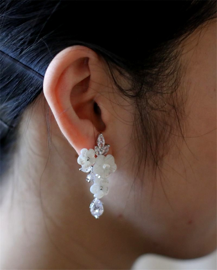 3枚目のお写真のイヤリングも先程のヘアアクセサリー同様、ホワイトのお花のモチーフのデザインとなっております。セットで付けて頂いてもとても可愛くコーディネートを楽しめます!