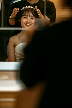 ヘアパーツをチェンジし、挙式スタイルへ整えていきます。
