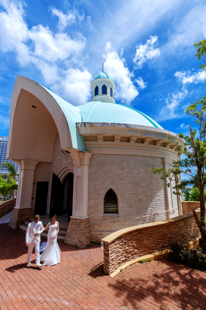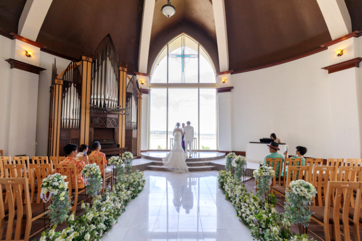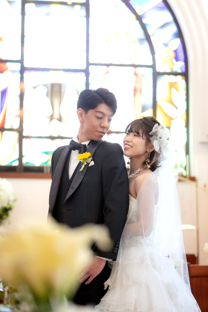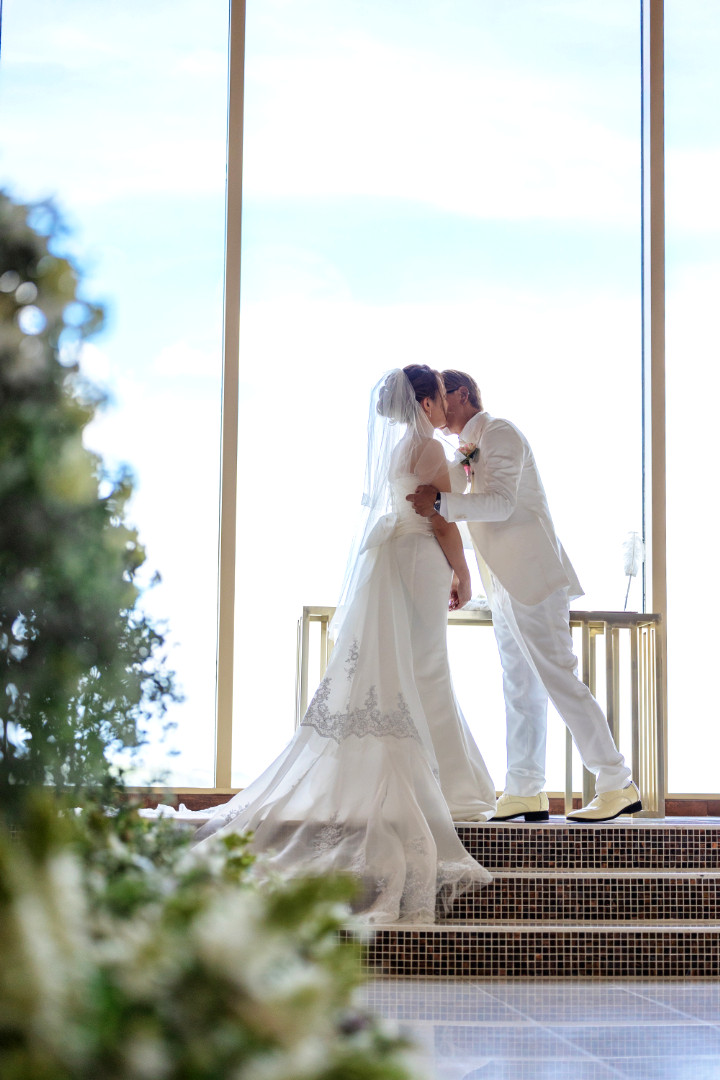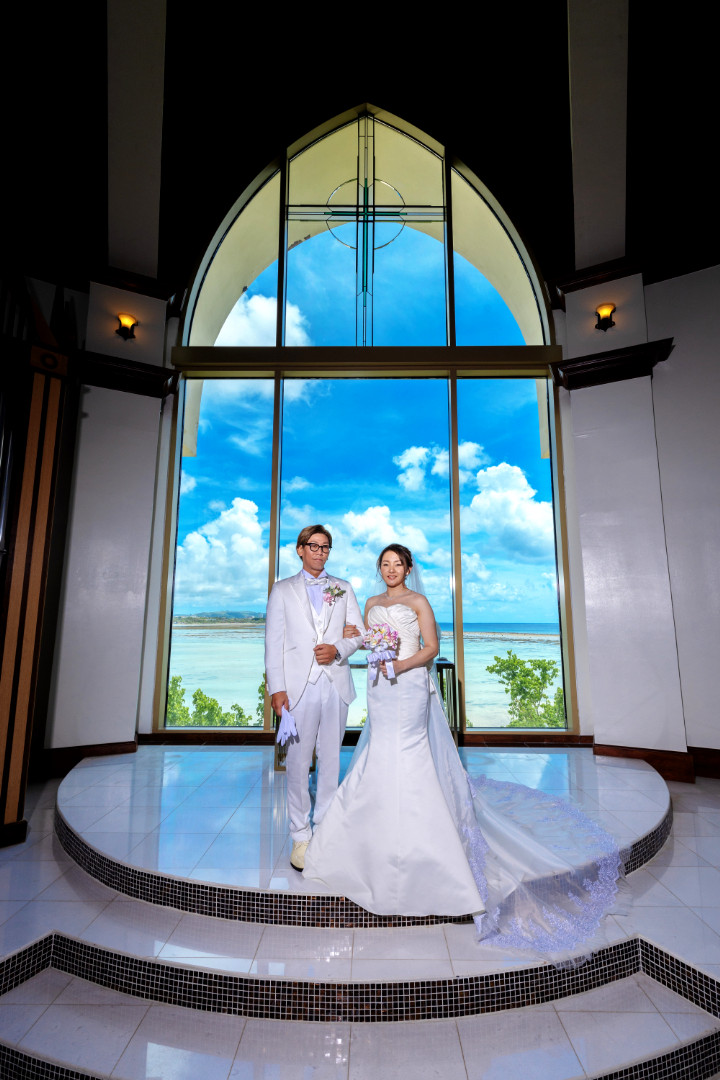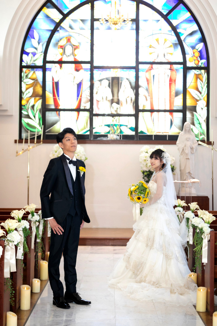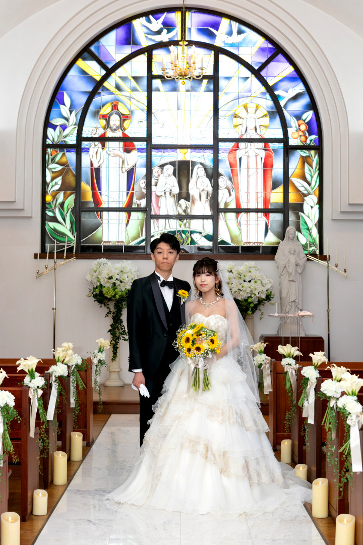 本場チェコの職人により作成されたブルーのステンドグラスが美しいチャペルでの挙式です。