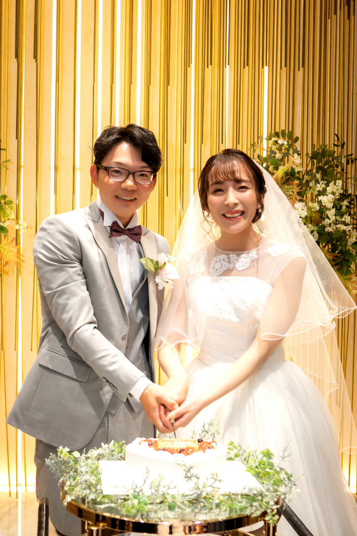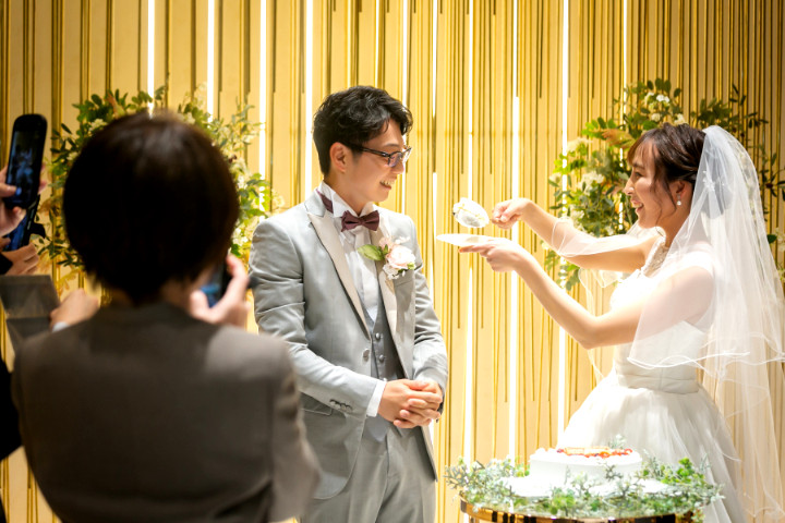 こちらのお写真の新郎新婦様はお式中にケーキカットやファーストバイトをしていただきました!