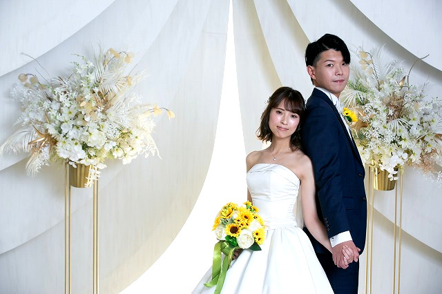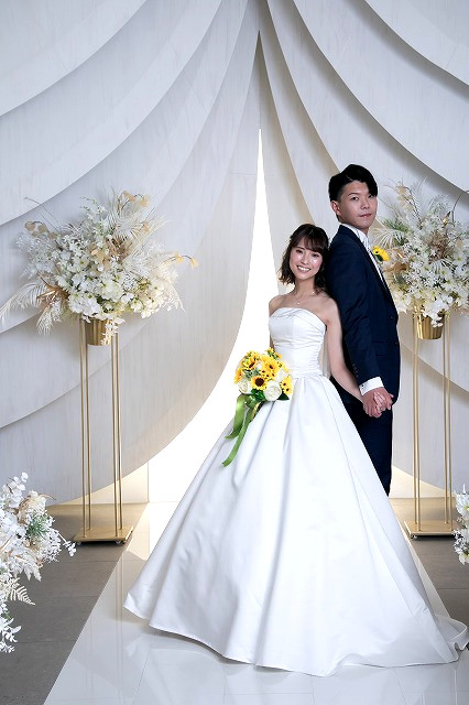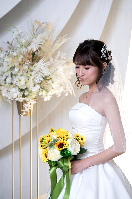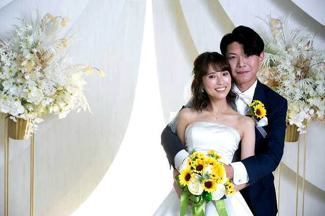 向日葵のブーケに負けないくらいお二人の明るい笑顔が素敵です✿