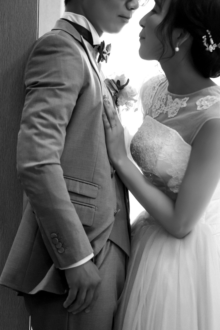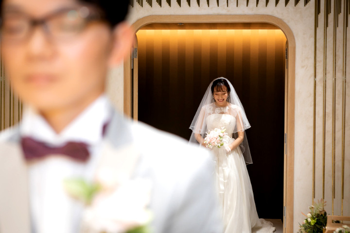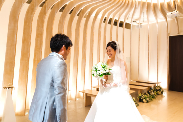 始めてみる新婦様のドレス姿に照れる新郎様。