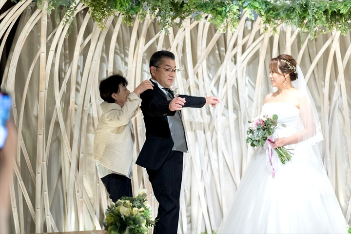 皆様の前で、ご新郎様は、お母さまからジャケットを羽織らせていただく