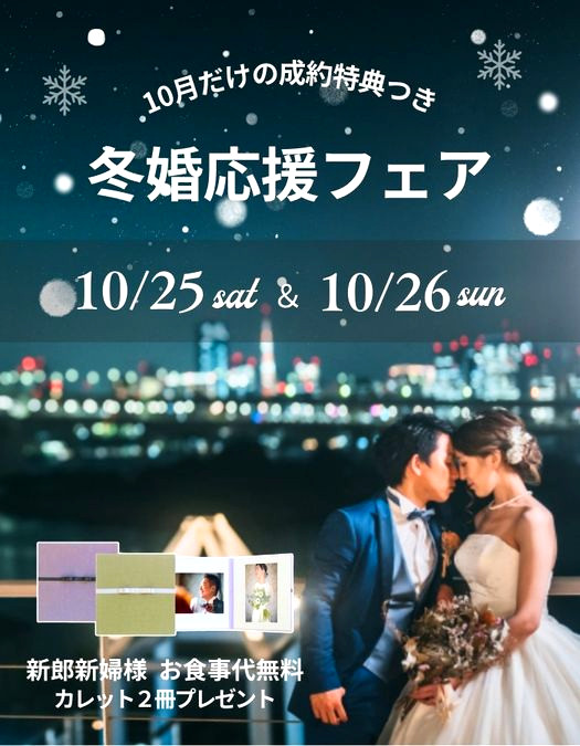 12月・1月・2月にご結婚式をご検討中のおふたりへ。 この時期だけのスペシャルな特典付きフェアを、10月限定で開催します!