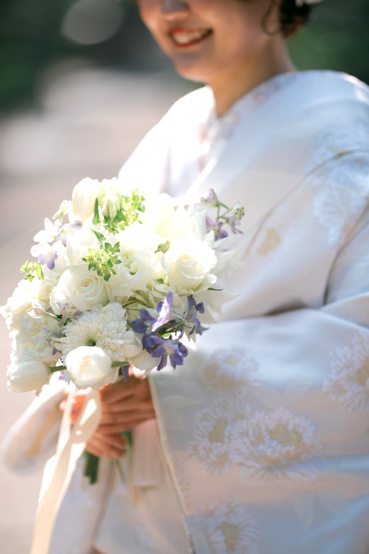白無垢に合わせた白色に新婦様のお好きな薄い紫色を入れたブーケ