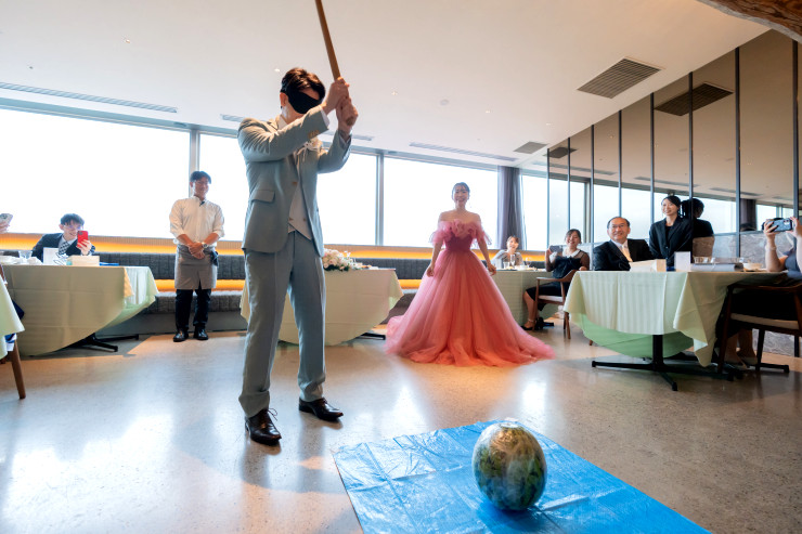 まずは新郎様が目隠しをして、3回のチャンスで挑戦!