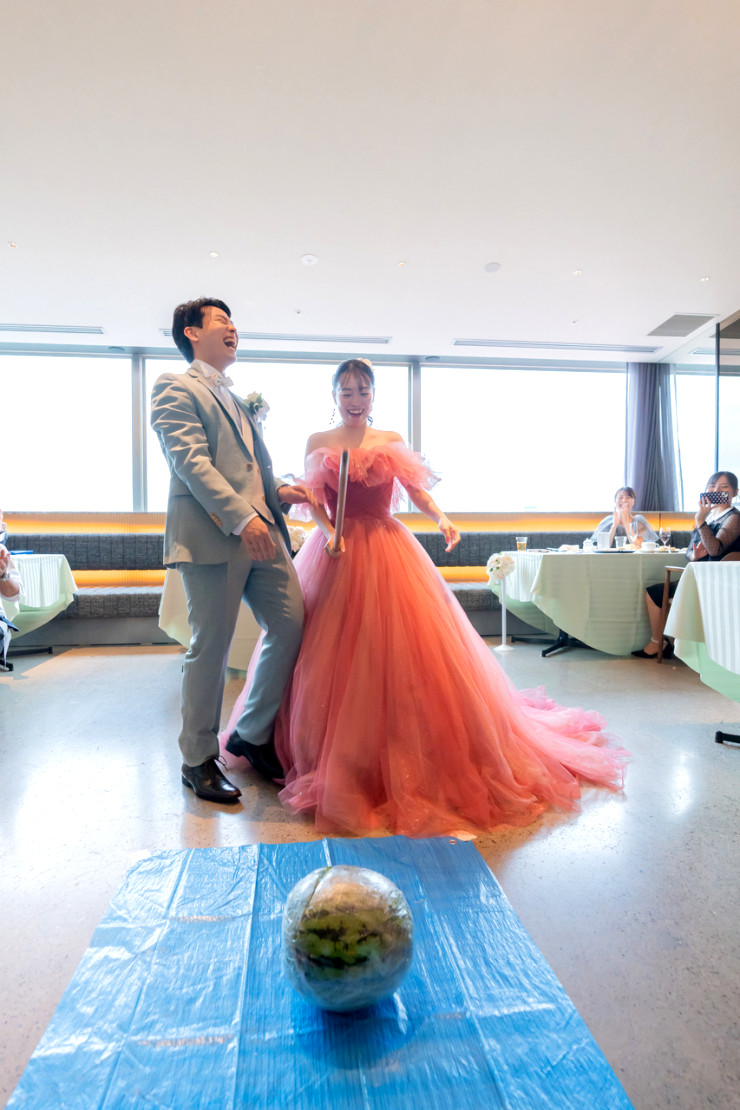 「右!もうちょっと左!」と大きな声援で会場は大盛り上がり。 最後は新郎新婦さまおふたりで力を合わせて、見事にスイカを割ることができました👏