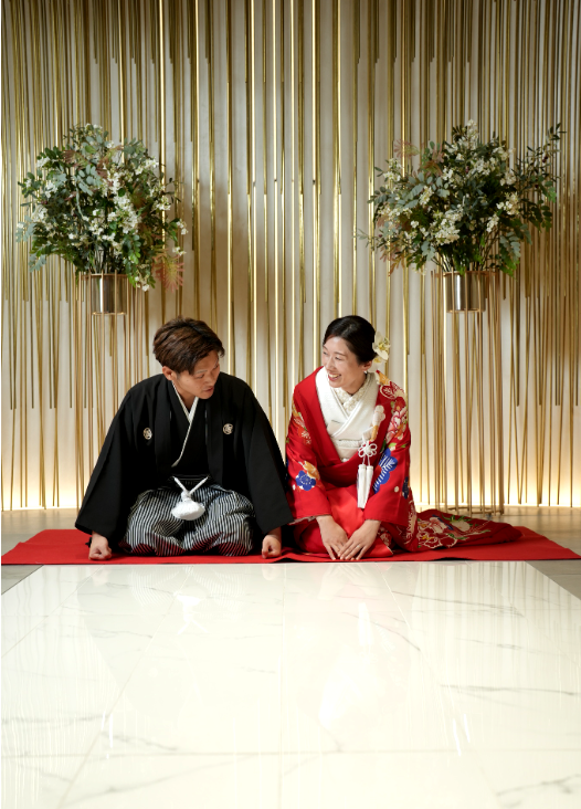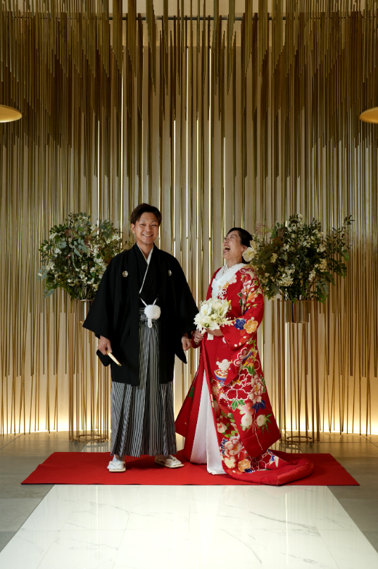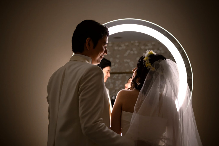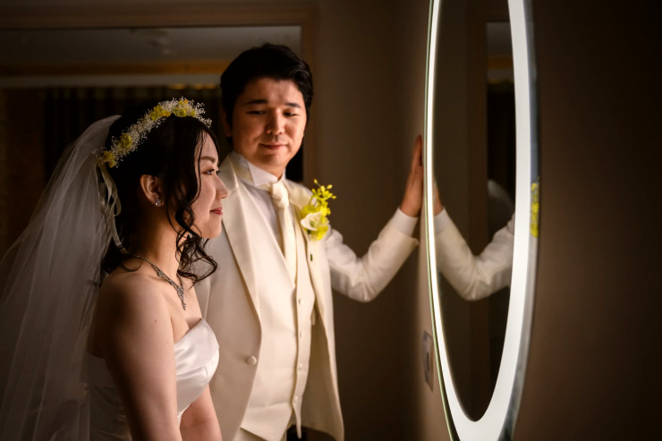 美しく仕上がった花嫁さまを見つめる新郎様も