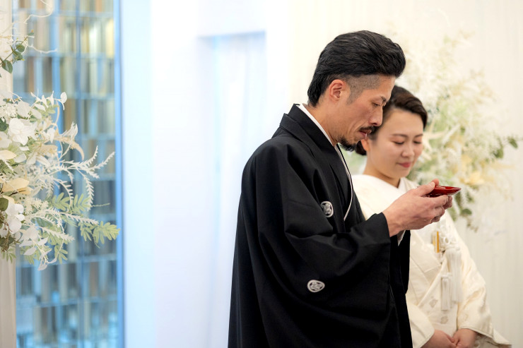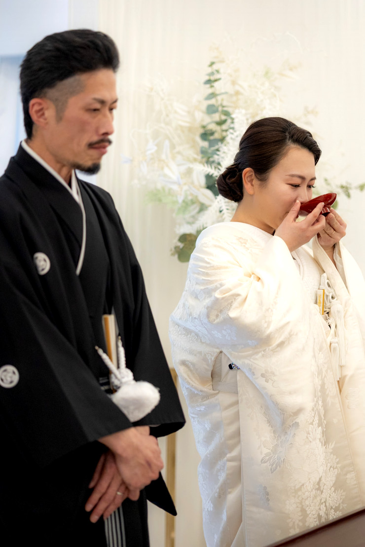 三々九度とは和装の結婚式で行われる伝統的な儀式で、新郎新婦様が交互にお酒を酌み交わす儀式のことです。