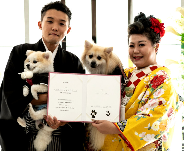 お二人が署名した誓約書には、証人としてペットの肉球スタンプが押されております。