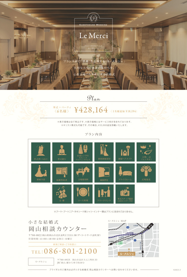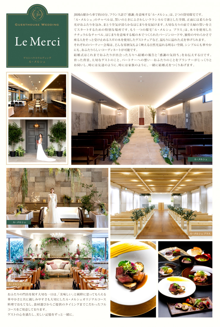 小さな結婚式岡山店にて衣装全般、スナップ撮影をお手伝いさせていただき、挙式や会食の内容はル・メルシェからご案内をさせていただきます。