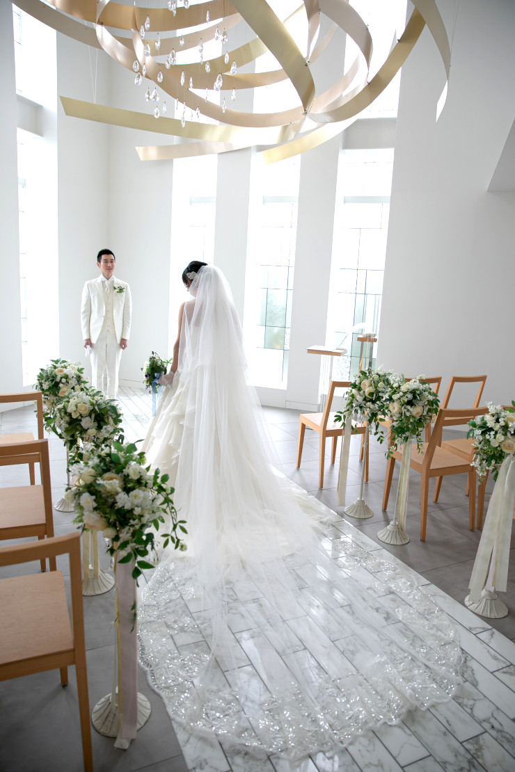 入場時は刺繍やスパンコールが施されたロングベールでご入場