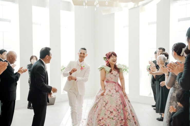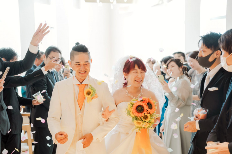 皆様にフラワーシャワーで祝福された新郎新婦。