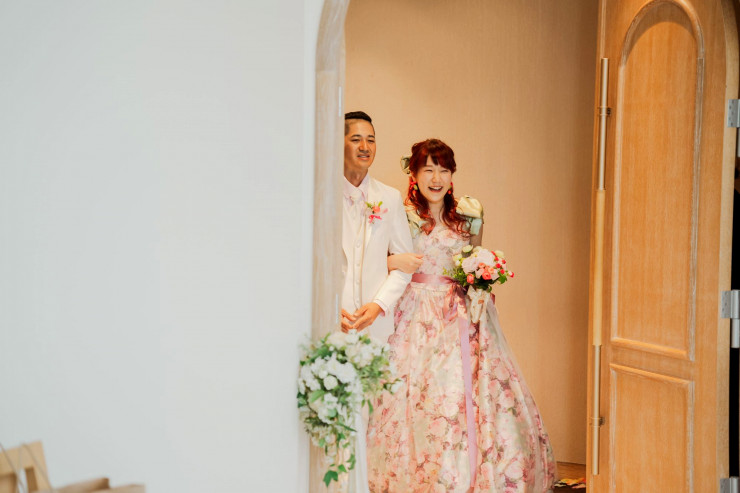 N様、わずか数分の間にかわいらしいピンクのお花柄のドレスにチェンジです!