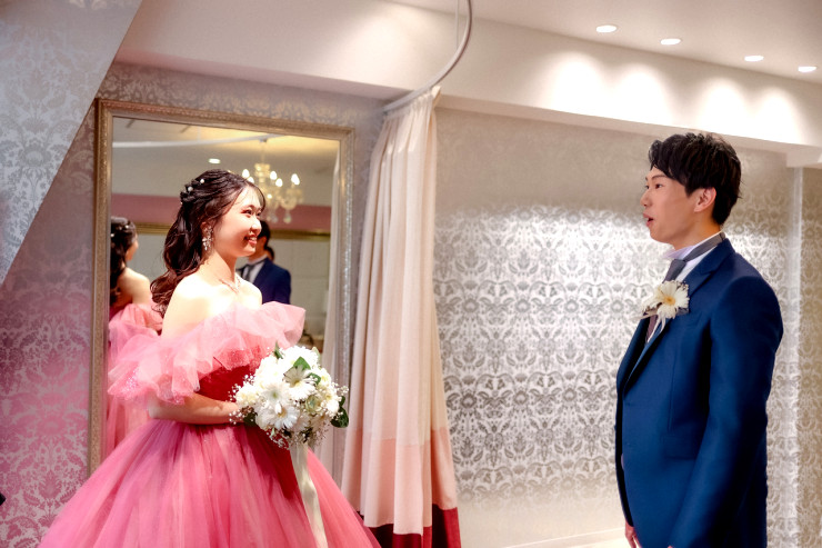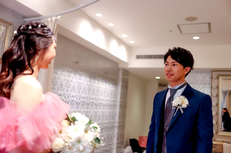 お衣裳合わせでは、新婦様のドレスを見ていない新郎様。