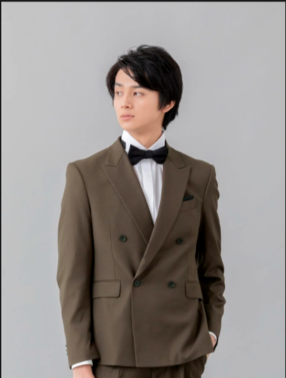 タキシードは、オリーブを感じるブラウンが爽やかなダブルブレスト。