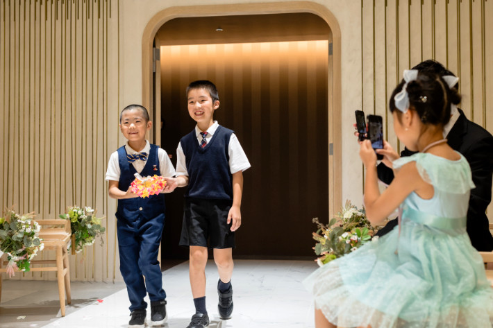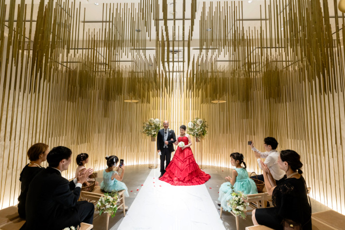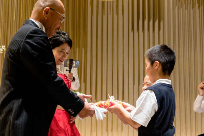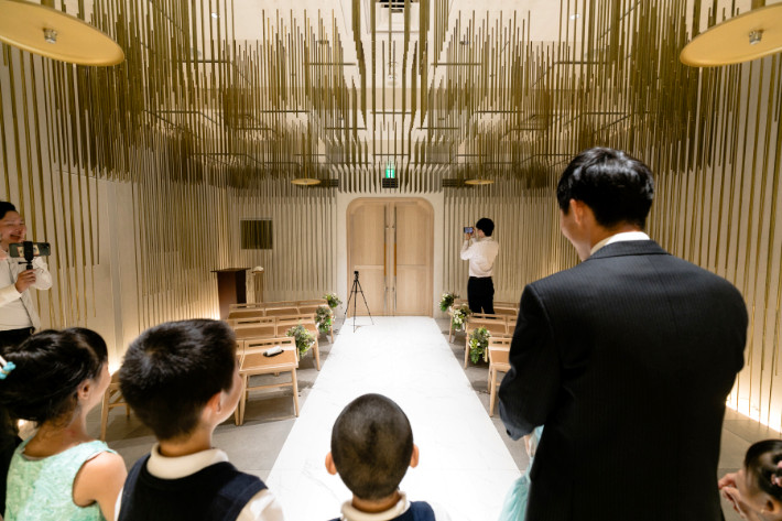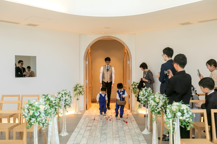 新郎様の入場時、お子様二人より花びらでバージンロードを彩っていただきました。