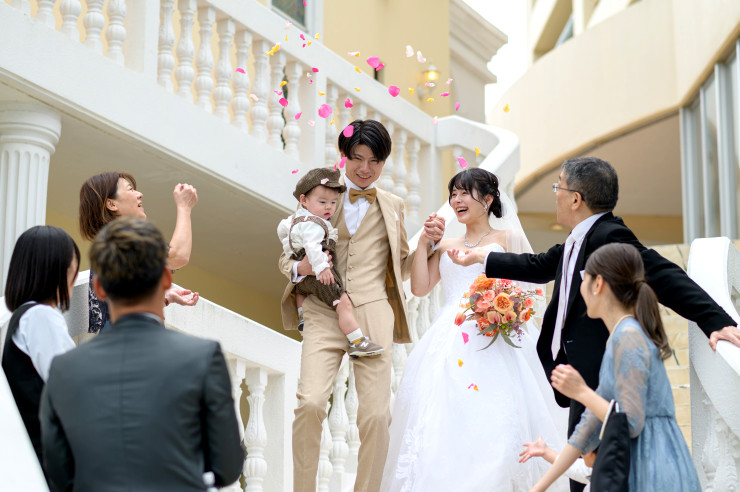 チャペル外階段では、ご家族様からの祝福のフラワーシャワーと共に、再入場でございます!