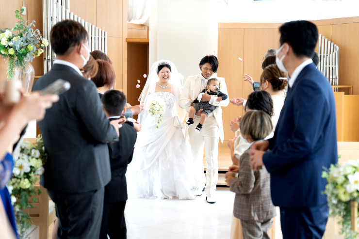 最後は皆様から祝福のフラワーシャワーの中、親子3人で退場しました!