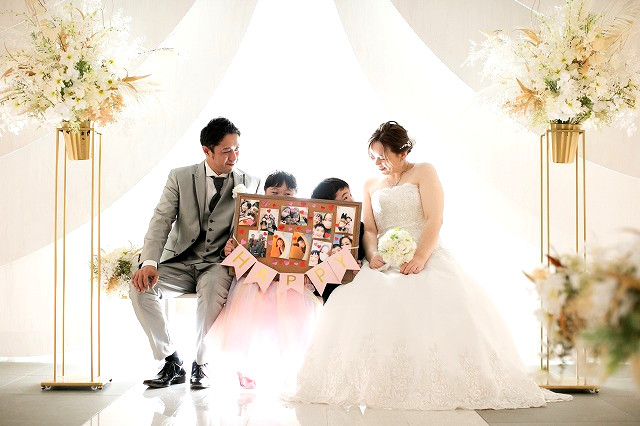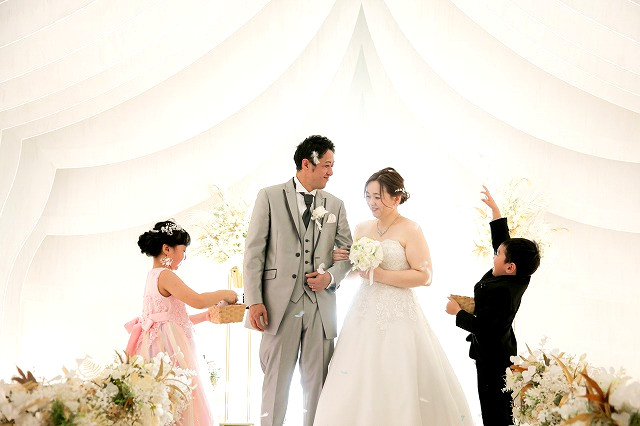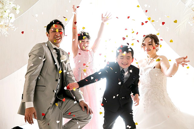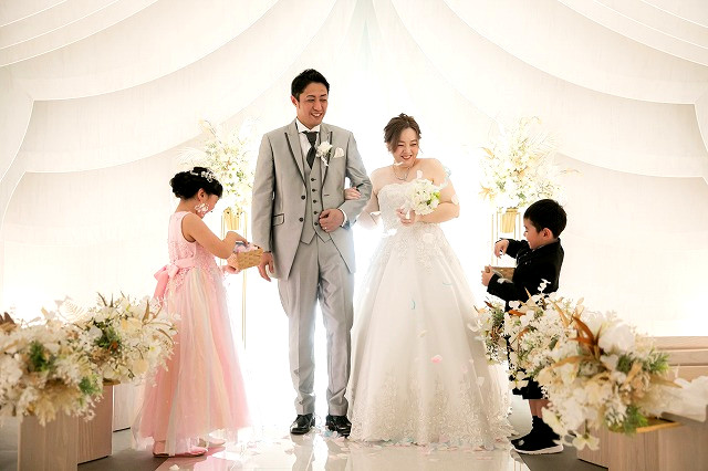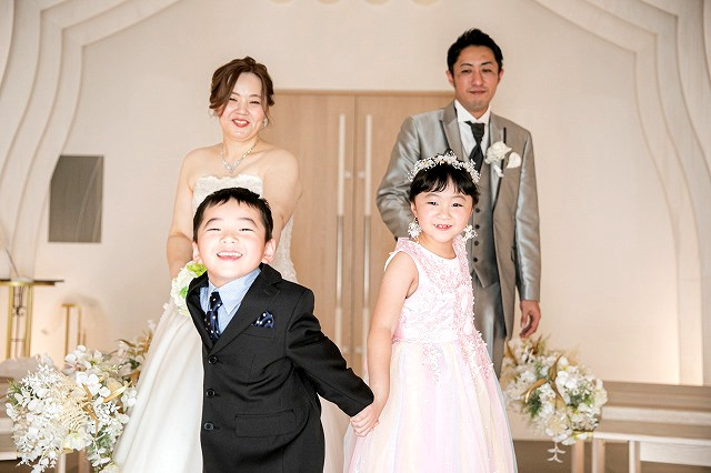 無事にセレモニーを終え、ご新郎ご新婦様とお子様とでご退場でございます。