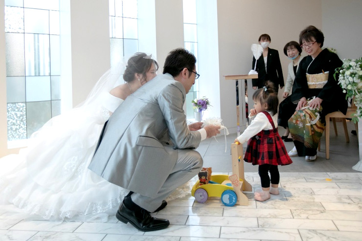 前撮りのお写真や記念の一品を飾り、皆様にご覧いただきながらお待ち頂くものとなります。
