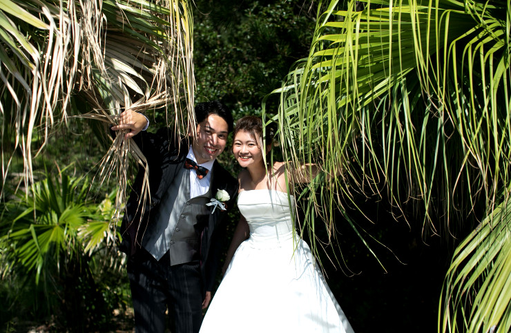 ホテルからすぐの美々ビーチで、エメラルドグリーンをバックにした撮影は