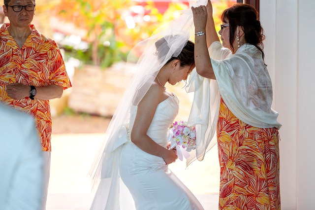 お母様にベールダウンセレモニーのお手伝いを頂き、お父様にエスコート頂きます。