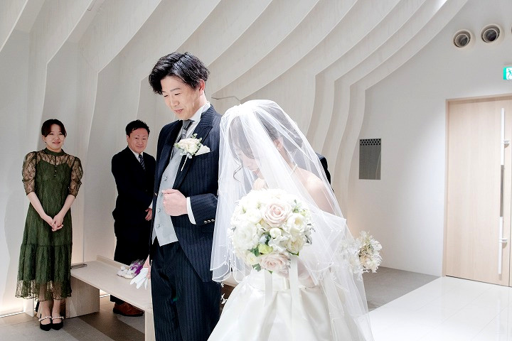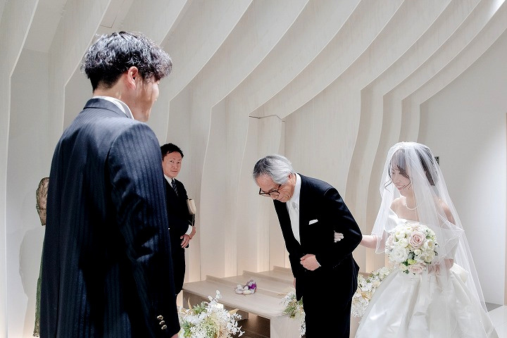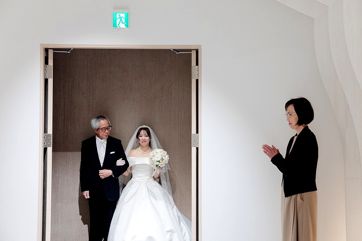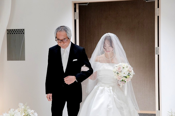 お母様からのベールダウンの後は、お父様のエスコートで進みます。