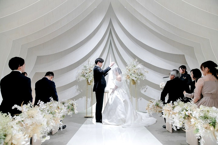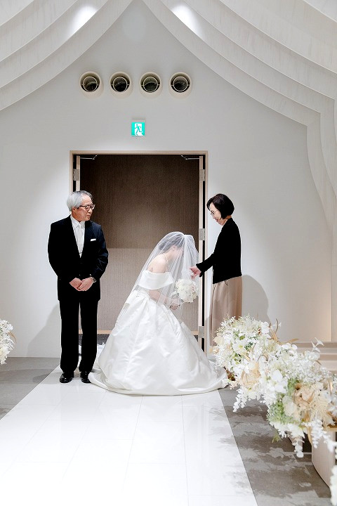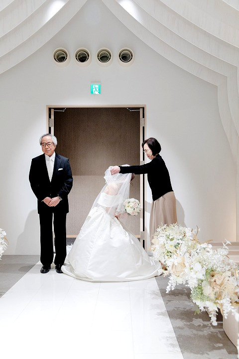 バージンロードを歩く前に、お母様によるベールダウンのセレモニーです。