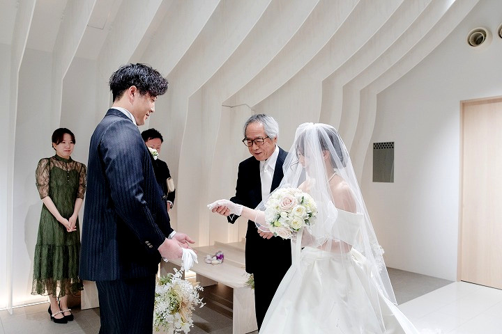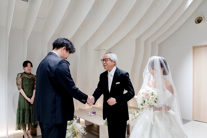 『娘をよろしく』の気持ちを込めて固い握手を交わして頂きます。