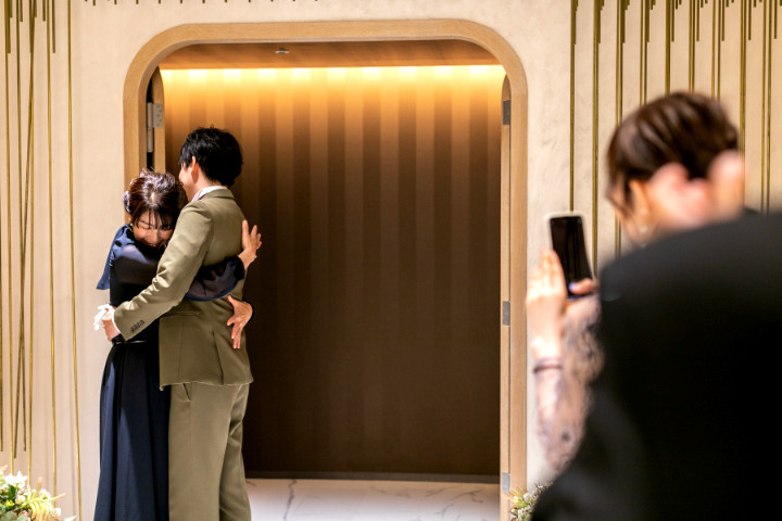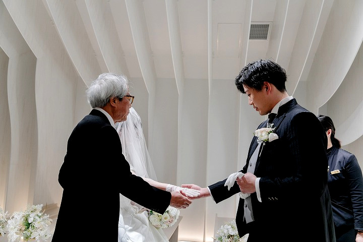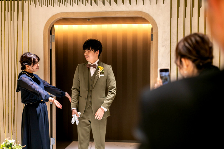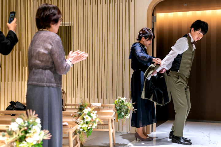 新郎の最後の身支度を、親御様に手伝っていただく演出!