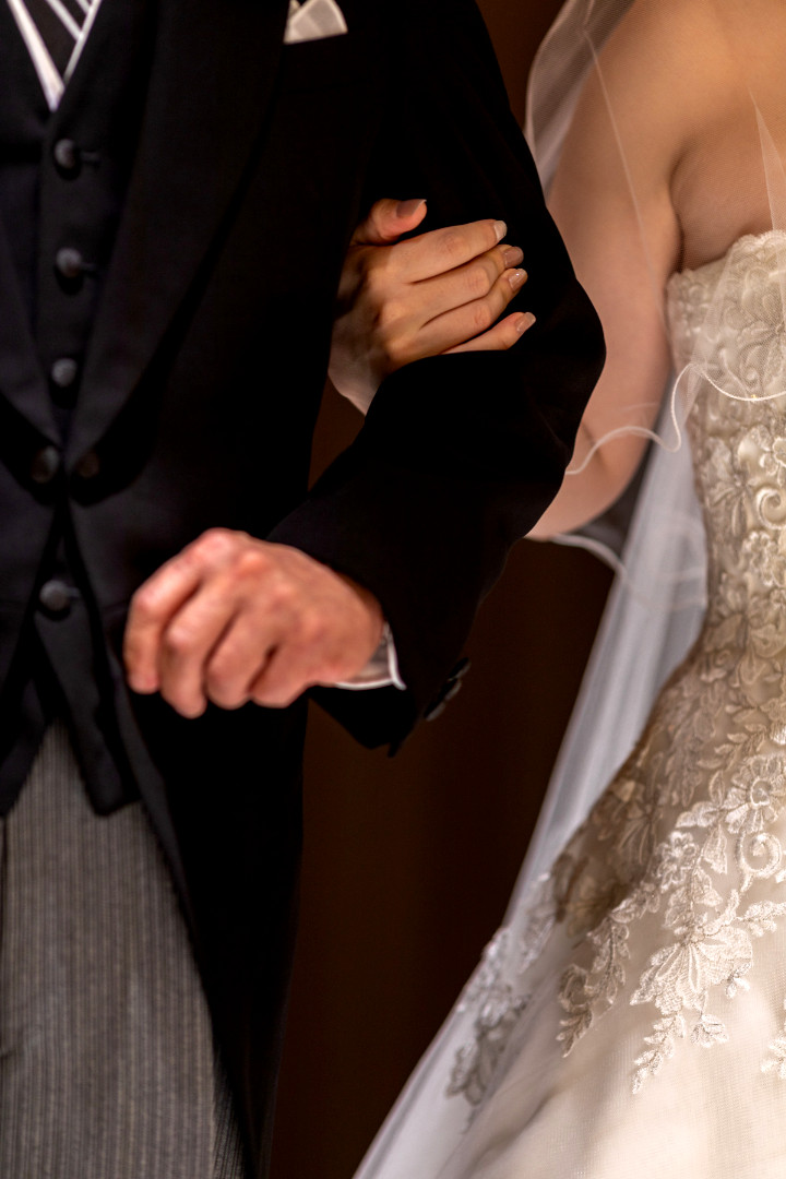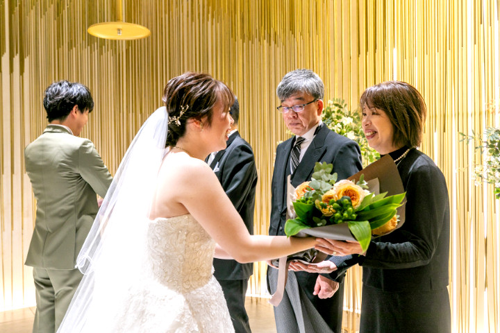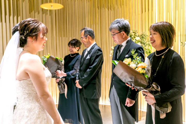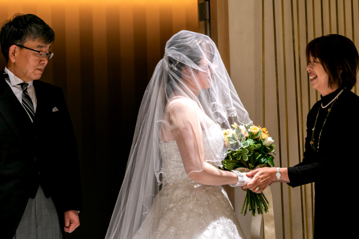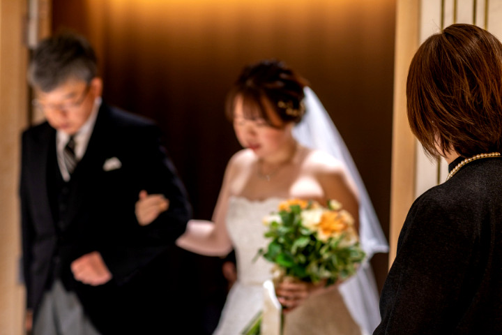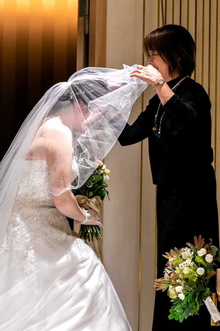 お父様にエスコートされ、お母様にベールダウンを行っていただきます!