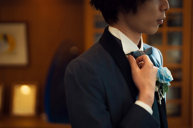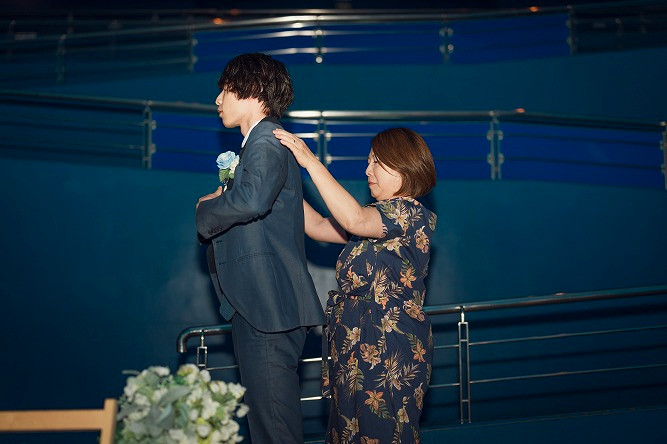 お母様よりジャケットセレモニーとして花婿の最後の身支度を整えて頂き、エスコートもお願いしました。