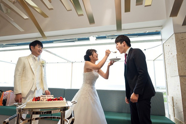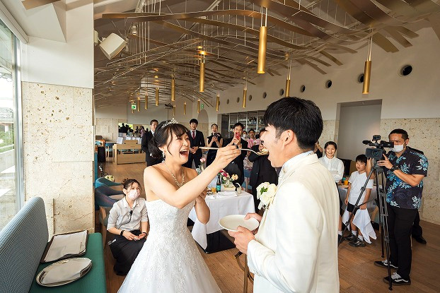 お手本を見せて頂いたあと、新郎新婦お二人によりますファーストバイトセレモニーです♪