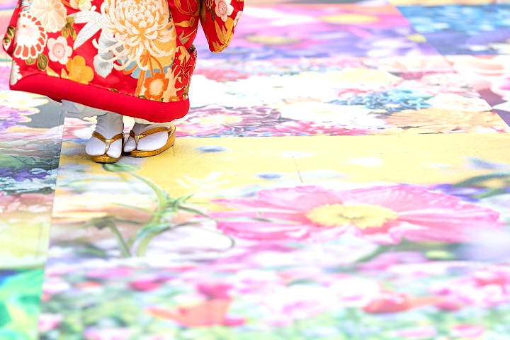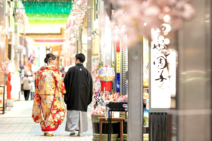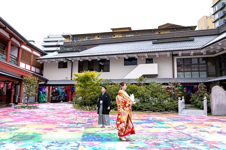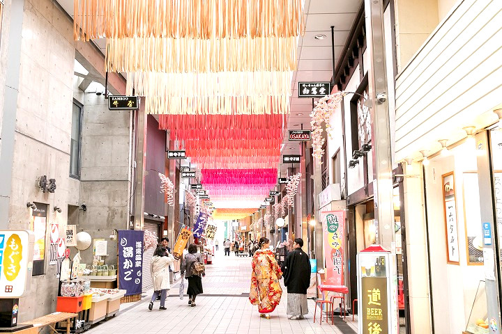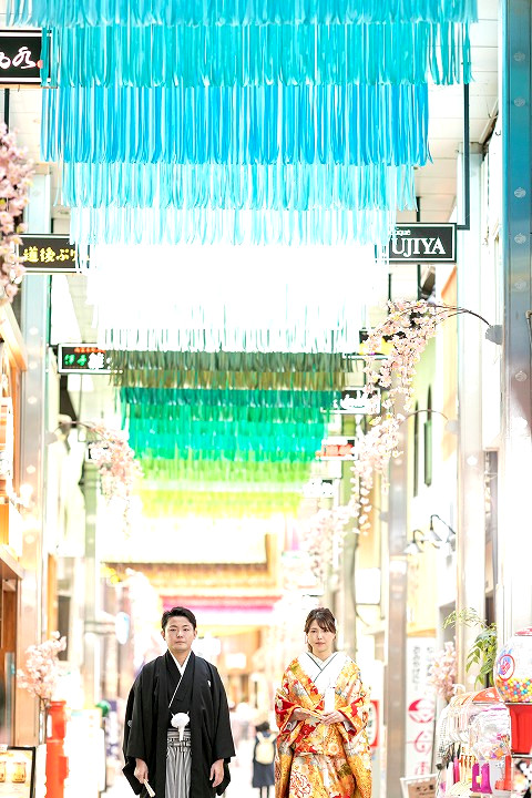 道後商店街のアーケードに100色のグラデーションアートが華やかにお2人を彩ります。