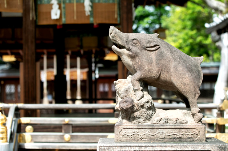 境内には狛犬ではなく、「狛イノシシ」が祀られ、足腰にご利益がある、
