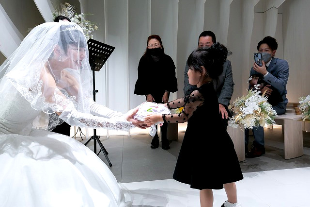 「最後の身支度」という意味を込めてお母様からベールを下ろして頂きます。
