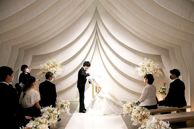 今までお二人を隔てておりました、薄い1枚のベールを新郎によりベールアップ