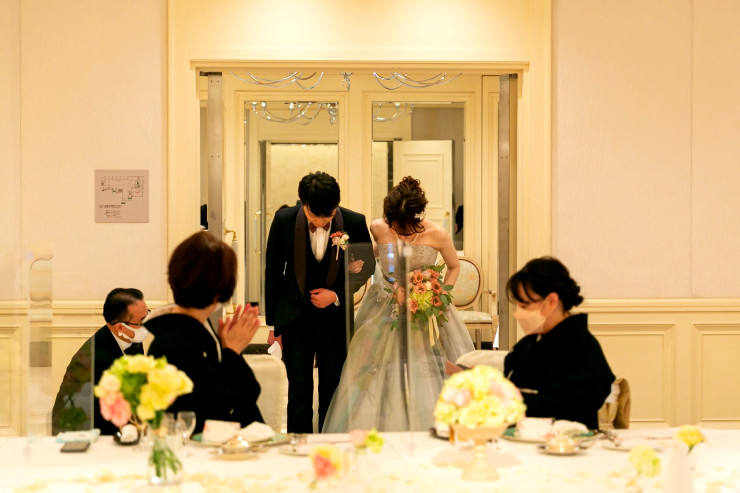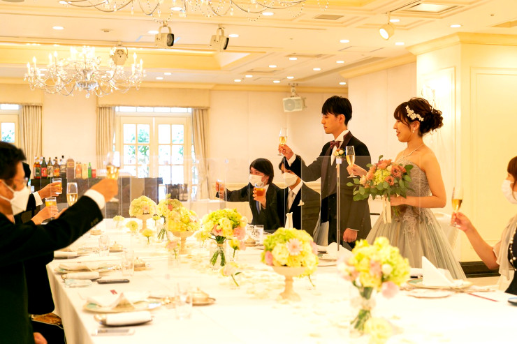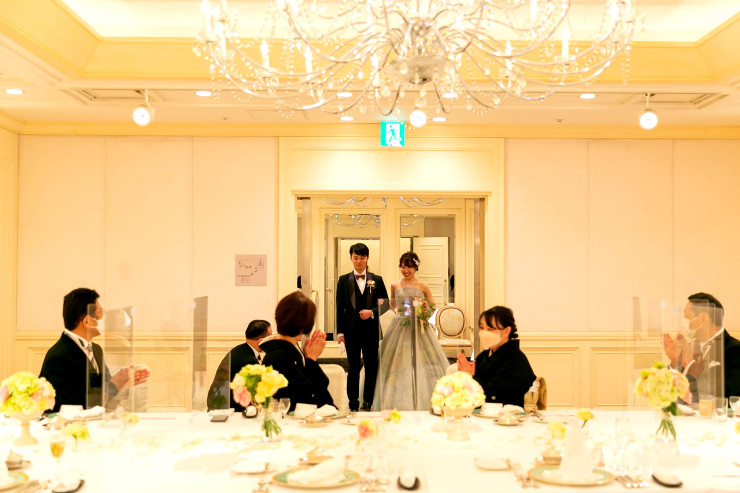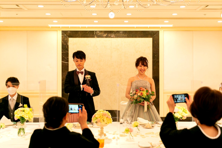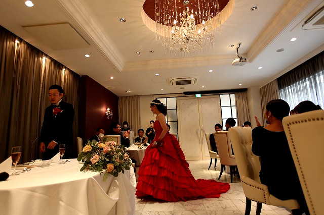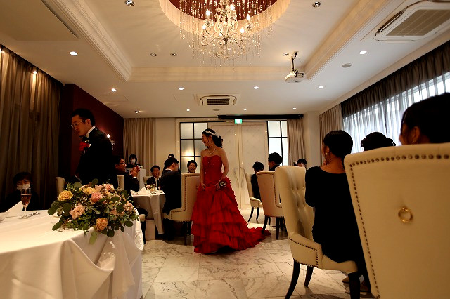 ご新郎ご新婦様も皆様の前にご登場です。ご新婦様はカラードレスにお召し替えです。