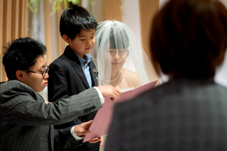 誓約の際、多くは新郎新婦お二人で誓いの言葉を述べていただくシーンとなりますが、お子様も新郎新婦様とご一緒に家族としての誓いを交わしていただきました。