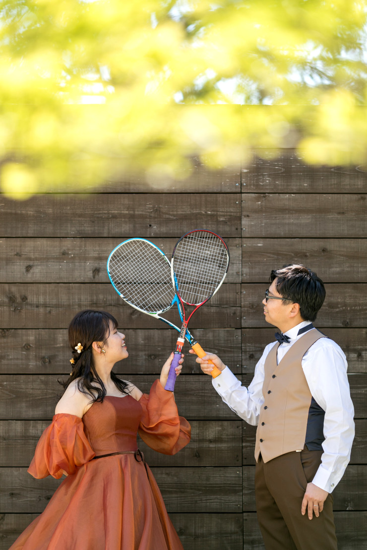 ブラックタキシードとのリンクコーデは、季節問わずフォトウエディングで映えるおすすめコーデです。