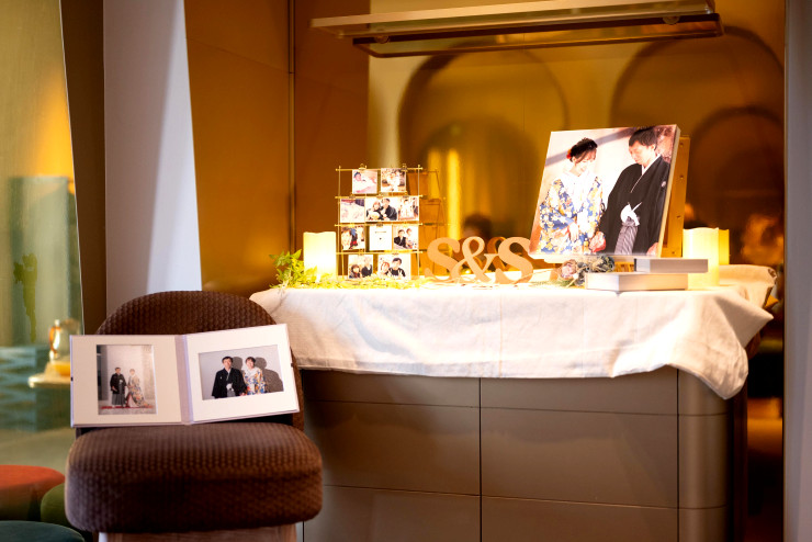 ゲストの皆様のお待ち合いの一画におふたりのお写真などを飾るスペースを設けることができ、