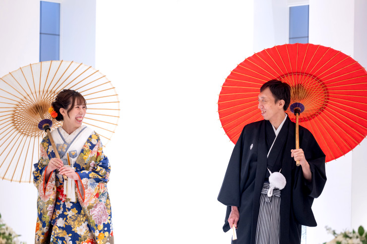 和装は黒の紋付袴と白無垢で決められたお二人✨