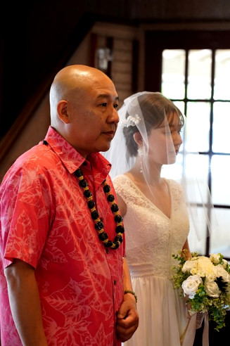新婦お父様エスコートで一緒にバージンロードを1歩ずつお進みいただきます。