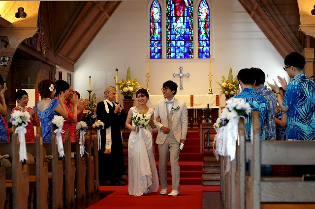 沢山の祝福の拍手と笑顔に見送られ、ご退場されるお二人。